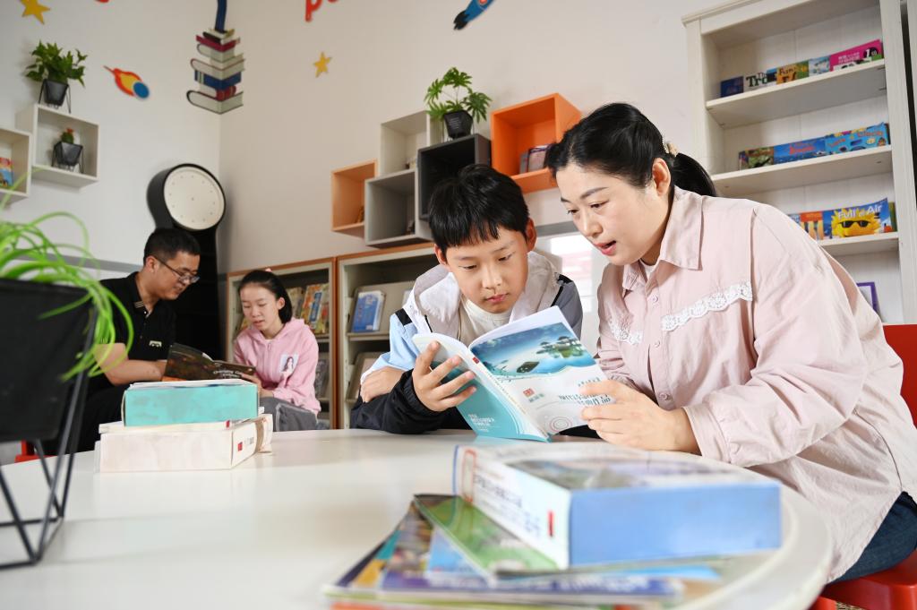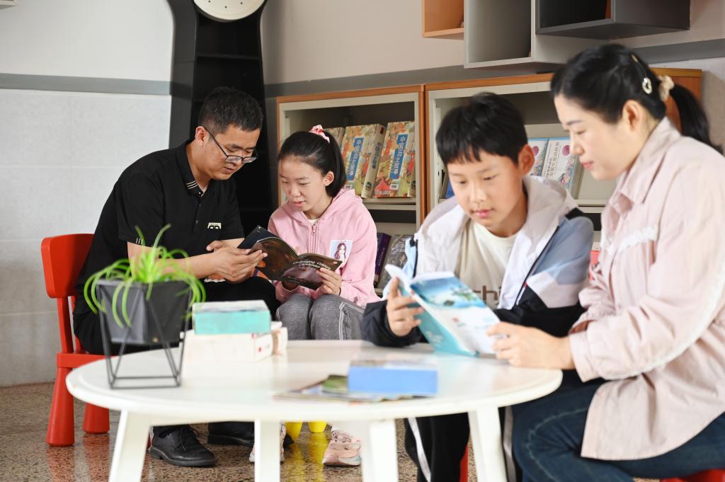 4月23日,珊瑚中铁小学的学生和家长在读书日活动上读书。