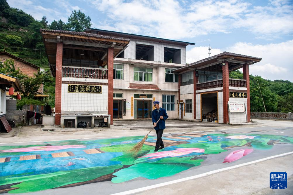 6月11日,在大金佛山环山趣驾路线上的庆元镇玉龙村三姑庄福庆小院,村民在打扫院坝。