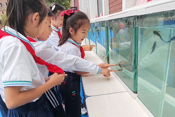 校园里,36块图文展板、15个水族箱活鱼展示更吸引着同学们参观停留。他们围成一圈,指着水中游动的鱼儿兴奋地观察讨论着。“这是国家一级保护动物,不能捕捞!”“草鱼和鲈鱼我吃过,但没想到还有这么多漂亮的品种!”三年级11班的董严鸽同学被中华沙鳅迷住了:“它身上的斑纹太美了!”另一名同学说,此次活动体验让她近距离了解了长江鱼类,感受到水生生物的魅力,也启发着自己用实际行动关爱水生动物,保护美丽家园。