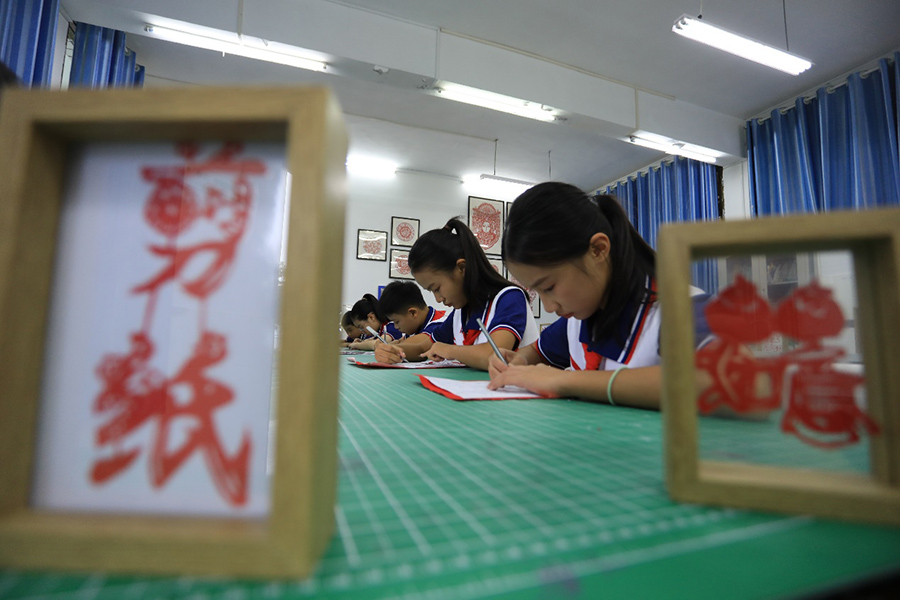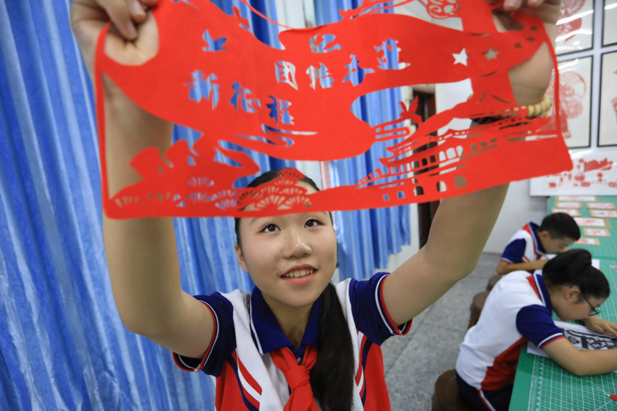 10月13日,一名学生正在认真检查自己剪纸作品。胡程 摄
