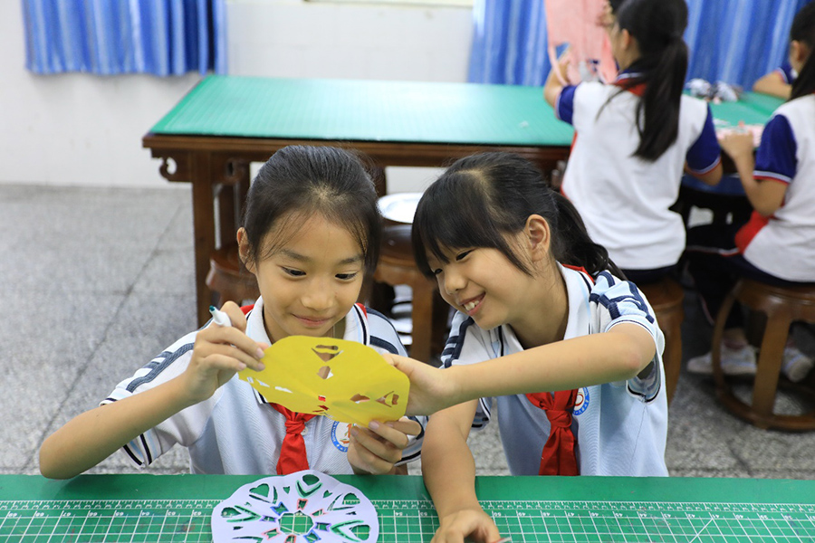 10月13日,两名学生正在交流剪纸心得。胡程 摄