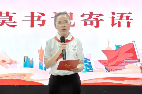 鲤鱼池小学党总支书记莫丽红谈道:“红领巾是烈士血与火凝成的火炬,从1949年飘扬至今,整整76个年头。今天佩戴上红领巾,就要在星星火炬指引下勇敢向前。请同学们把‘小我’写进祖国‘大我’,让读书声与心跳声同频,时刻准备着成长为社会主义事业的可靠接班人!”