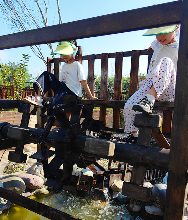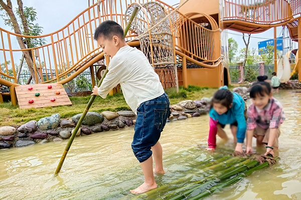 在地形利用上,园所没有将平坦场地简单硬化,而是模拟自然地貌打造“多元探索场”。原先仅仅60厘米宽的“泥猴溪”被改造成三段式生态空间,上游拓宽为“戏水塘”,投放竹梯、木板、树干让孩子搭建“桥梁”,玩跳水、竹篮打水、桥下穿梭等游戏;中游种植荷花、菖蒲等水生植物,饲养鲫鱼、小龙虾等生物,孩子们用树枝测水深、用渔网捞田螺,在观察中理解生态关系;下游制造落差,设置竹筏、水车,即使寒冬也能体验“漂流”的乐趣。