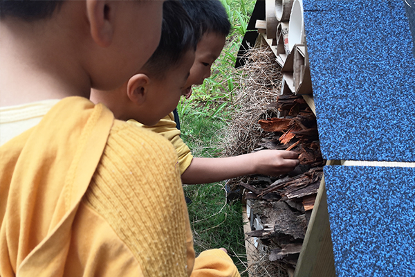 孩子们将受伤的小蟋蟀送到“昆虫旅馆”。