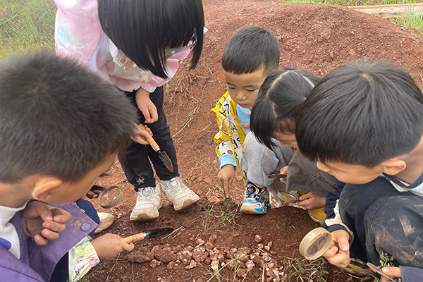 在园外荒山探秘基地,孩子们的荒野探索充满了对“自然奥秘”的挖掘与发现。他们带着小铲子、放大镜,沿着布满碎石与杂草的山坡跋涉,突然有孩子大喊“快看,这有‘恐龙化石’!”(孩子们将白色石膏石称为“恐龙化石”)。一群孩子立刻围拢过来,有的用铲子小心刨开周围的泥土,有的用放大镜观察石膏石的纹路。“哇,发现头骨”“发现腿骨”,惊喜不断传来。过程中,他们发现石膏石嵌在坚硬的土层里,直接挖容易碎裂,便自发找来树枝当杠杆,一点点撬动土层;清洗时,又小心翼翼地生怕弄坏“化石”。“化石”被完整拼成恐龙呈现,孩子们还自发搭建展示台,轮流讲解“这是翼龙”“这是三角龙”。教师全程未干预,只是记录下孩子们从“发现”到“挖掘”再到“展示”的全过程,而孩子们在与荒山环境的互动中,不仅学会了使用工具、解决问题,更萌发了对古生物与地质的好奇。