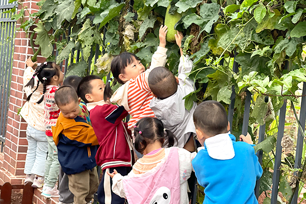 孩子们在观察、比较中寻找藤上最胖的丝瓜。