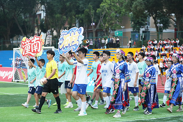 此外,揭幕战上还进行“我为家乡代言”环节。代表涪陵区的班级用创意舞蹈再现榨菜制作工艺;代表梁平区的学生以灵动舞姿展现梁平柚的丰收景象;潼南区的代表队用“酸甜”主题演绎柠檬特色;石柱县的同学们则带来了原生态的土家歌舞……这些充满创意的展示,让足球赛场同时成为重庆地域文化交流的舞台。