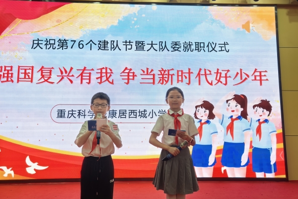 在庆祝第76个建队节暨大队委就职仪式上,重庆科学城康居西城小学校全体少先队员齐唱队歌、重温少先队誓词。学校为新一届大队委授予标志、颁发聘书,当选者庄严宣誓,将正式肩负起“服务学校、服务老师、服务同学”的责任,开启少先队工作新篇章。