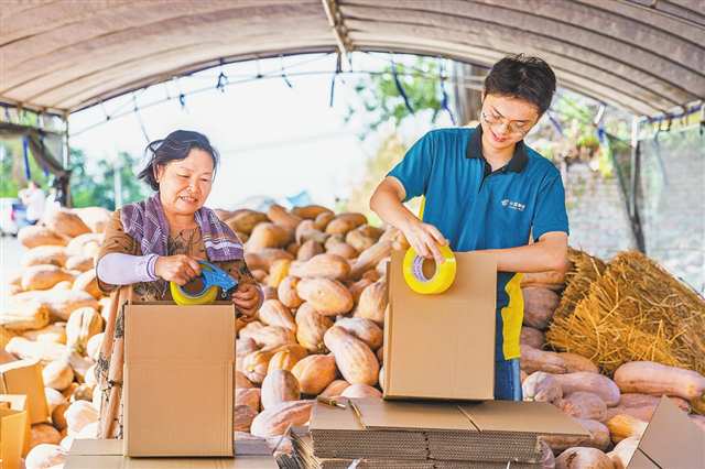 垫江县白家镇,工作人员与农户协作封装货物,助力农产品外销。(受访者供图)