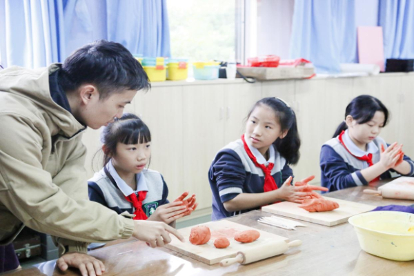 同学们在老师指导下对手中泥塑揉搓塑形。