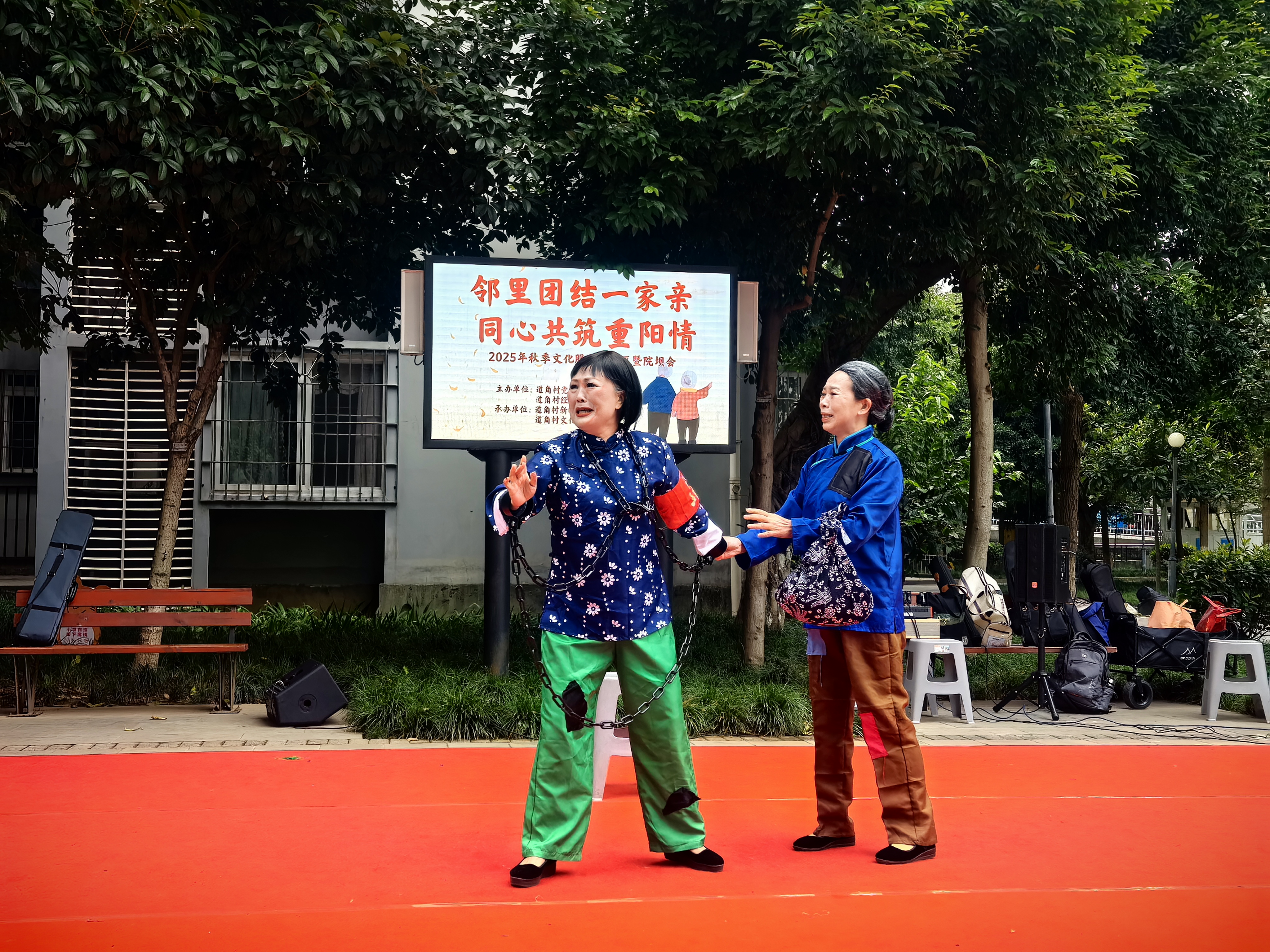 金秋送爽,丹桂飘香。10月23日至24日,在重阳节来临之际,为弘扬中华民族“尊老、敬老、爱老、助老”的传统美德,巴南区龙洲湾街道道角村走进辖区回龙、北房嘴、金色田园、黄桷佳园四个安置房小区,开展了为期两天的“文艺进小区”重阳节主题活动,为老年居民献上了一场丰富多彩的视听盛宴,并通过寓教于乐的方式传播了实用知识,让老人们在欢乐祥和的氛围中感受到了社区的温暖与关怀。