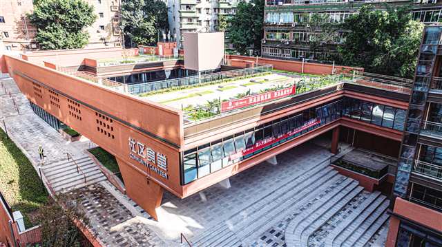 面对难题,綦江区住房城乡建委另辟蹊径,充分挖掘社区消极绿化空间,拆除危房3栋、约3700平方米,腾挪出约5500平方米的公共空间。项目团队创新山地设计手法,因势造坡,缓解区域内13米垂直落差,联通上下居住区便民生活圈。以新建社区服务用房、养老公寓、社区食堂、停车库等约2万平方米建筑体为支撑,打造集山地交通、公共配套、社区服务于一体的立体综合体,让老旧社区重新焕发生机。