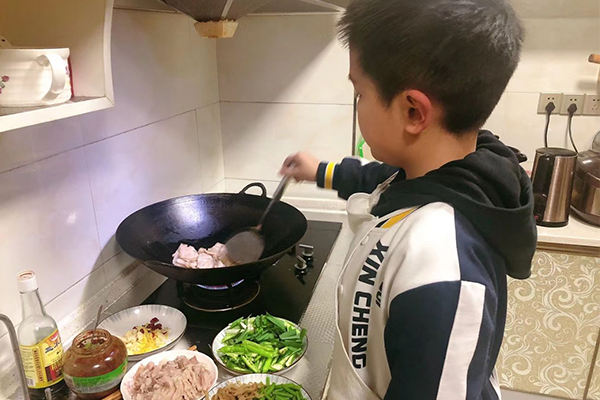 渝北区空港新城小学学生在家制作美食。
