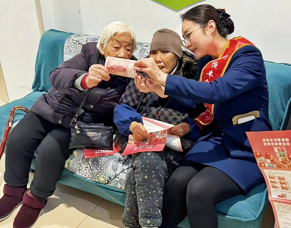 工作人员为老年客户普及人民币相关知识。