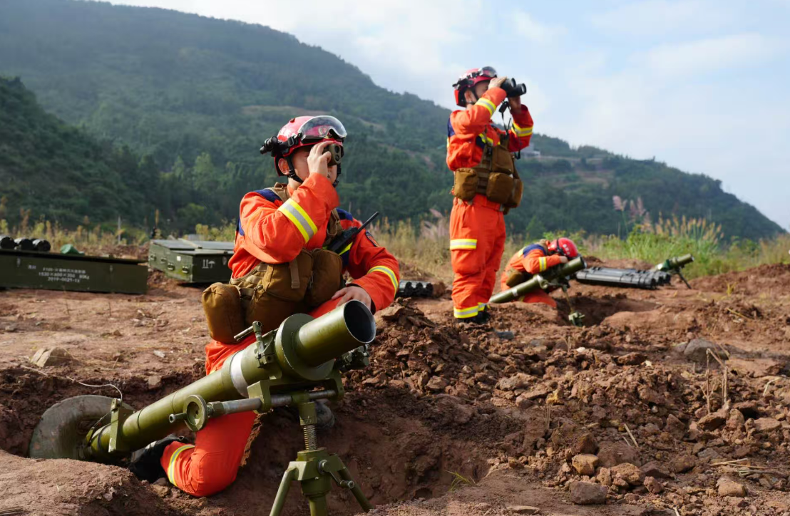 森林灭火炮测距校正。(重庆市专业应急救援总队供图)