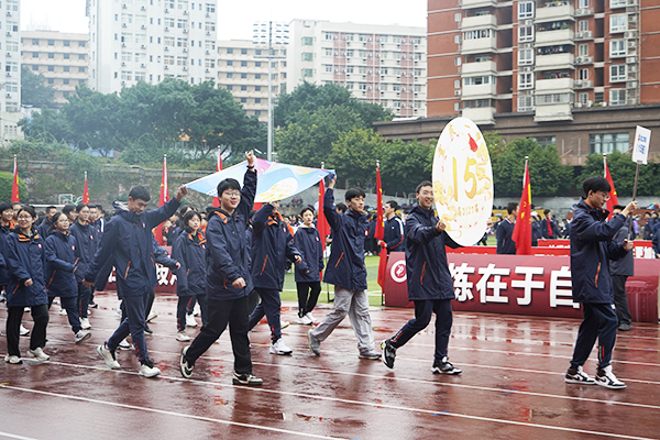 开幕式上,来自重庆一中初一、初二、高一、高二的82个班级方阵列队入场。同学们高举班徽、班旗,昂首阔步走过主席台。他们步履铿锵,活力十足。一句句精心设计的加油口号,展示着他们在此次运动会上团结一致、奋勇拼搏的决心与信心。