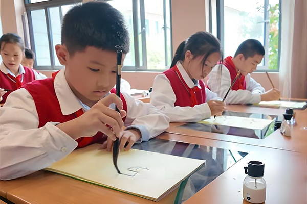 重庆市大足区香国小学智慧书法室里,墨香依旧。方寸电子屏上,一个“洗”字的“诞生”过程被全程捕捉,结构布局、笔锋走势,经由书法名家查律“面对面”精细讲解后,交互式屏幕前的60余名香国学子手持毛笔,跃跃欲试……