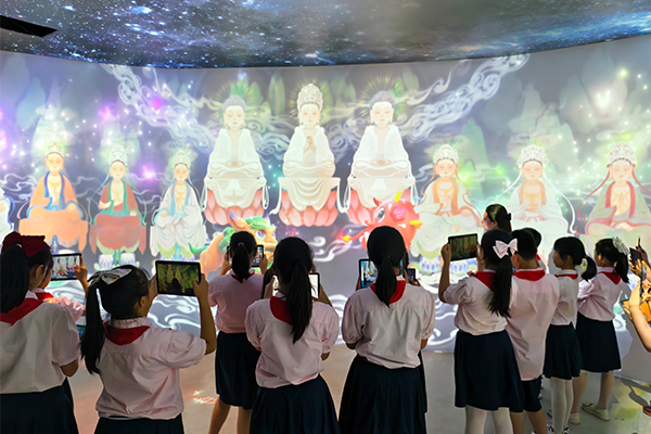 在这里,孩子们可以通过VR仿真模拟,沉浸式观摩“百变千手观音”,体验大足石像贴膜、修补、贴金箔等“一条龙”文物修复教学;可以AI对话“梦幻圆觉”千年石像,面对面聆听“可说可动”的卡通“圆觉”带来的知识科普,还可以一键扫码拓印体验空间的二维码,亲手体验一把拓印技术,在实践中传承石刻艺术。
