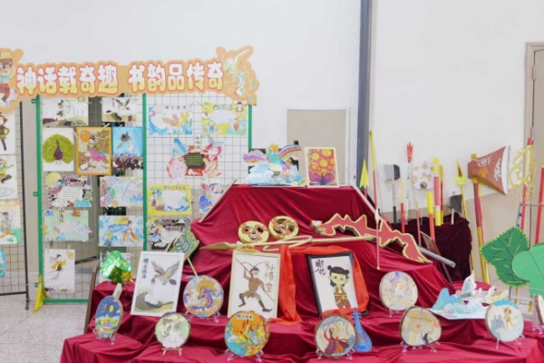 展示区内,同学们阅读神话相关书籍后,凭借想象力创作的艺术作品。