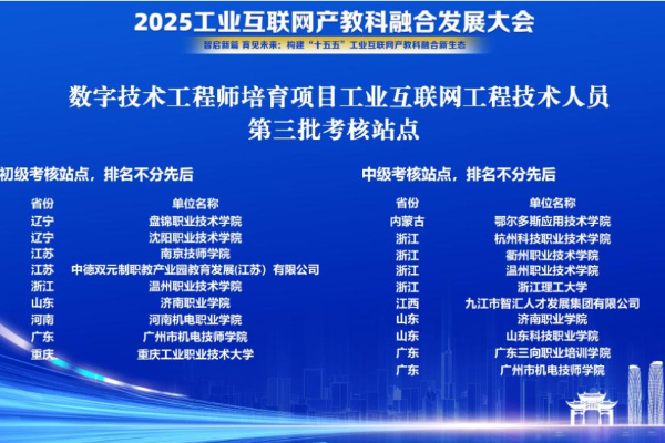 日前,在2025工业互联网产教科融合发展大会上,发布了数字技术工程师培育项目工业互联网工程技术人员第三批考核站点名单,重庆工业职业技术大学成功获批成为重庆高校工业互联网工程技术人员(初级)考核站点。