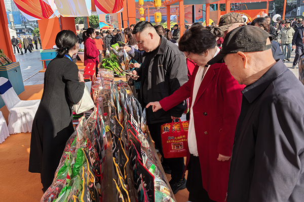 参展企业向市民推介梁平豆筋。(葛琦 摄)
