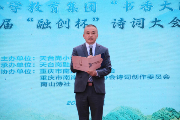 天台岗融创小学校长徐勇在致辞中强调,诗词是中华文化的基因密码,学校始终以诗词教育为传统文化传承的核心载体,通过“文化长廊”“书香校园”“亲子共读”等多元举措,让经典浸润成长,寄语同学们要以诗为伴、传承经典、不负韶华。中国当代著名诗人、词作家李尚朝则以“少年情怀总是诗”为赠言,鼓励同学们在诗词中汲取勇气与力量,保持纯粹好奇的童心与意气风发的朝气。