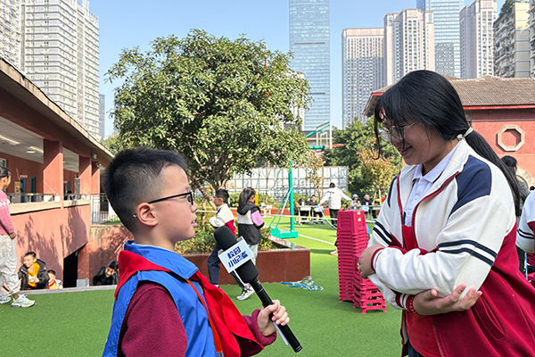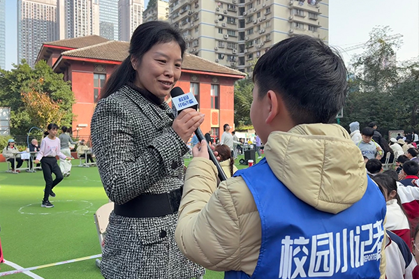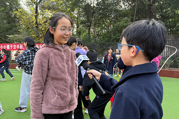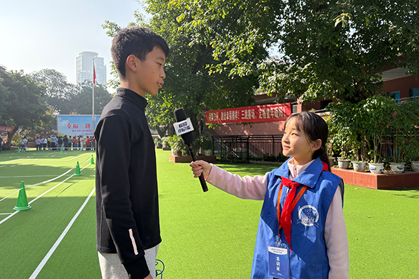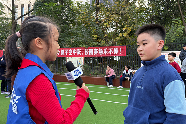 校园小记者胡俊彦深入活动现场积极了解同学们参与运动会的感受。