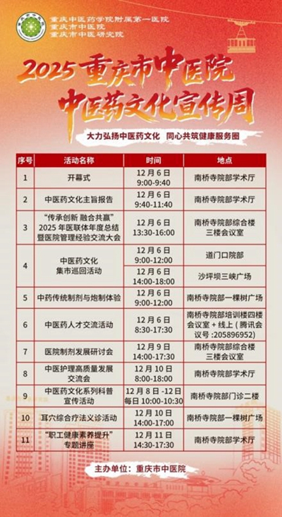 2025年12月6日上午9:00-12:00,重庆市中医院将在南桥寺院部举办“中药传统制剂与炮制体验”活动。该活动由该院制剂中心牵头,旨在弘扬中医药文化,推动中医药知识普及,让市民近距离感受中医药的传统技艺与现代应用。