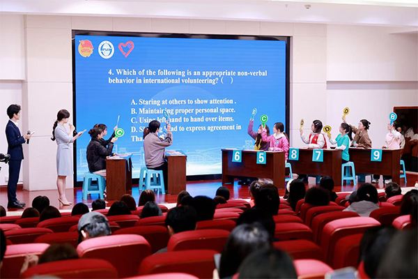 “大学生志愿服务西部计划志愿者的服务期为多久?”“志愿者在处理跨国志愿服务纠纷时,优先适用的法律依据是什么?”“志愿服务活动应当遵循的首要原则是什么?”知识竞答环节,围绕志愿服务政策法规、应急处置要点、沟通服务技巧等,设置了必答题、抢答题、风险题三类题型的轮番考验。选手们从沉着应答到敏捷出击精准抢答,每一轮交锋都点燃现场的热烈氛围。