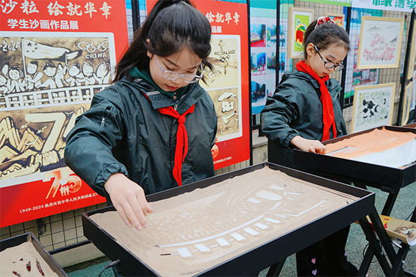 活动现场,学校十周年教学成果展成为焦点。“诗意沙韵社”“弦歌雅韵社”“武德弘光社”等十多个社团集中亮相,多元呈现了学校“五育融合”育人体系的创新实践。其中,学校自主研发的一套小学语文沙画教材尤为独特,学生在教材指导下,以沙为墨、指尖成画,不仅展现了艺术教育的创新突破,也成为“诗意教育”融入课堂的生动见证。(谢兰兰)