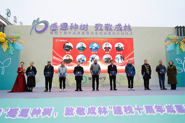 仪式上还举行了富有象征意义的“橡树捐赠”环节,泷泮生物科技有限公司西南地区负责人程飞以树为礼,向学校捐赠橡树庆贺建校十周年。