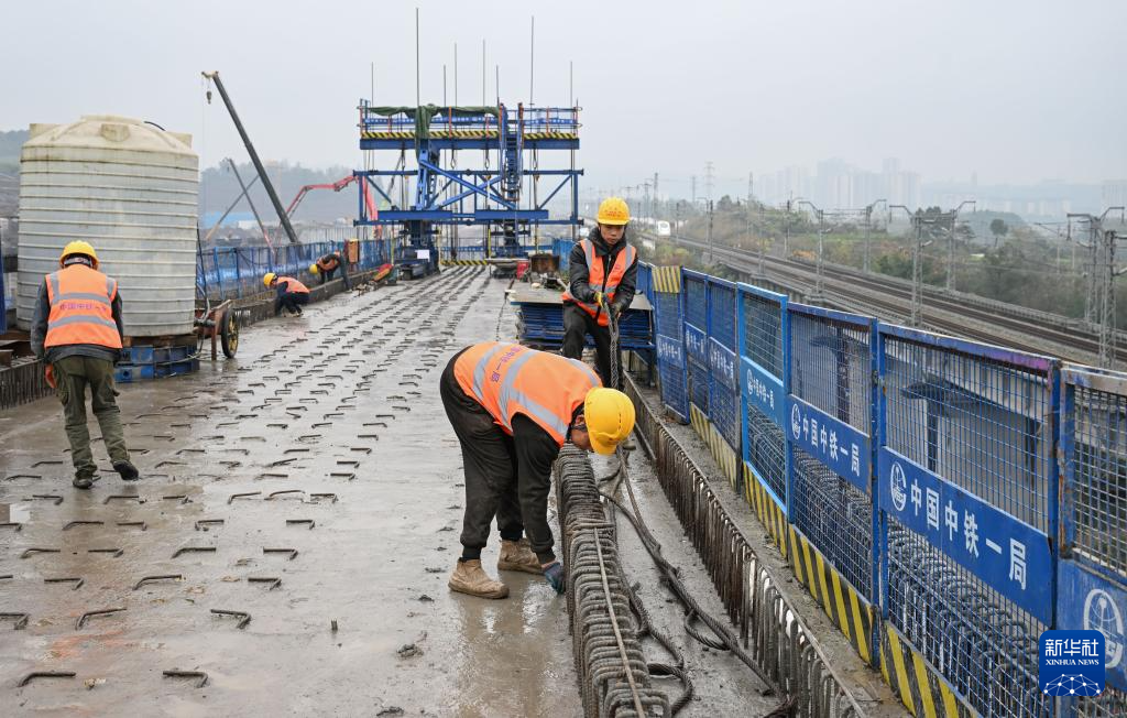 12月25日,工人在渝万高铁打青沟左线大桥连续梁建设现场施工作业。新华社记者 陈诚 摄