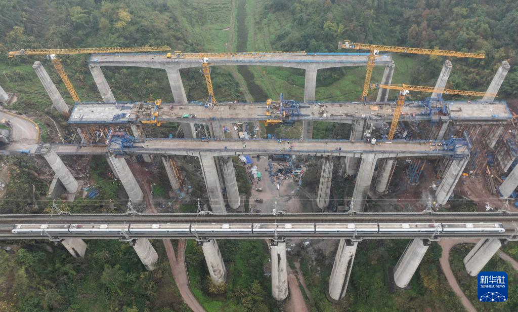 12月25日,列车驶过渝万高铁打青沟左线大桥连续梁建设现场。新华社记者 陈诚 摄