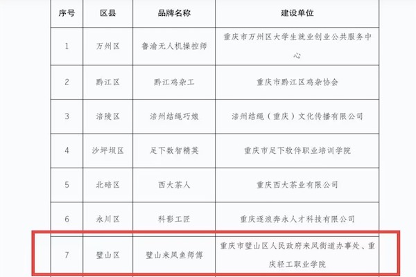 同步发布的“璧山来凤鱼师傅”劳务品牌,由重庆轻工职业学院与璧山区来凤街道办事处联合申报,目前已成功纳入市级重点库。