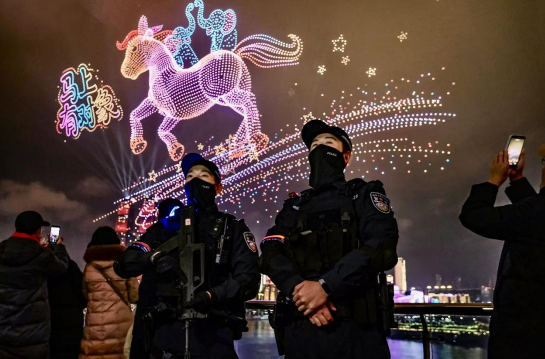 在南岸区的元旦无人机表演现场,民警提前踏勘场地,科学划定无人机飞行管控区域与观众观赏区,在现场设置多道安全防线。表演期间,民警全程值守,引导观众有序驻足、文明观看。