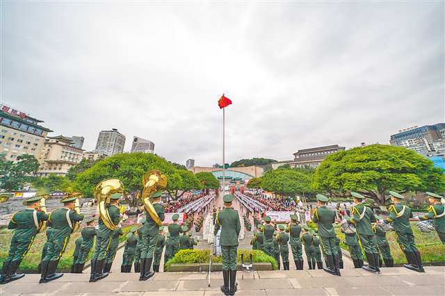 “向国旗——敬礼!”口令声落,擎旗手振臂扬起国旗,雄浑激昂的《义勇军进行曲》响彻广场,现场全体人员庄严肃立,齐声高唱国歌,注视着鲜艳的五星红旗冉冉升起,直至旗杆顶端,迎风飘扬。