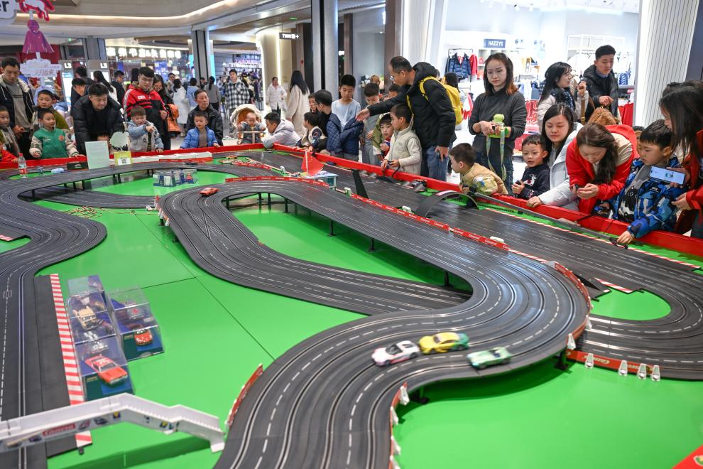 1月2日,在重庆两江新区一商场内,小朋友体验赛车玩具。