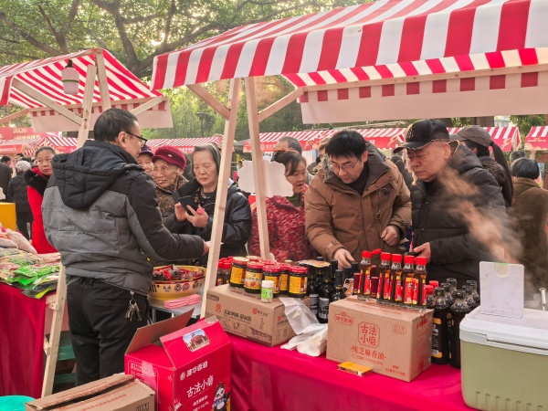 市集内,花椒鸭喷香扑鼻,豆瓣酱咸香下饭。“刚刚买了香肠和坚果礼盒,又方便又划算。”家住附近的张阿姨提着满满两大袋年货,开心地说道。