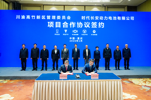 1月14日,时代长安动力电池项目在雾都宾馆举行签约仪式。川渝高竹新区管委会、时代长安动力电池有限公司负责人现场签订协议。