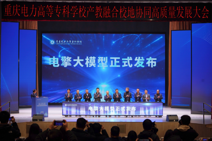 随后,大会发布重庆电力高等专科学校打造的“电擎大模型”。该模型集AI助教、助学、助研、助管、助训、助评、助国际交流七大核心能力于一体。在教学、学习、科研、管理、实训、培训、评估及国际交流等关键环节,为师生提供精准高效、个性化的智能支持;同时深化产教融合,为电力企业定制开发专属培训模块,助力电力产业工人能力提升。