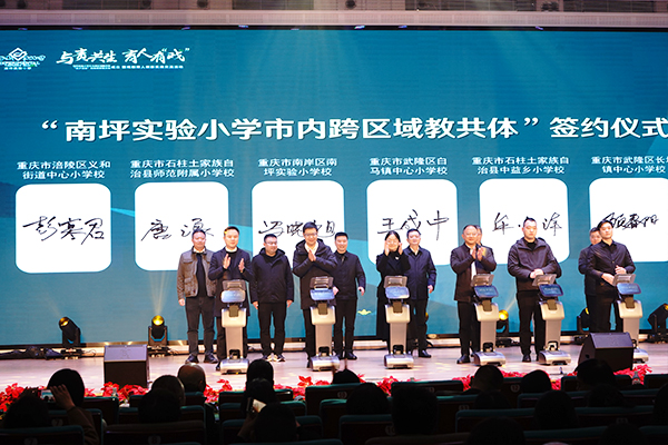 活动中举行了两大签约仪式。先是“南坪实验小学市内跨区域教共体”签约,学校携手涪陵区、武隆区、石柱县的兄弟学校,深化市内教育的辐射与共生。紧接着,“京沪成渝”四地四校教共体”正式签约,北京市海淀区太平路小学、上海市静安区和田路小学、成都市龙泉驿区第一小学与重庆市南岸区南坪实验小学跨越山海,握手相连,搭建起跨省市教育协作新机制。两份协议,一份深耕巴渝,一份联动四方,共同指向资源共享、师资共育、课程共创的未来。