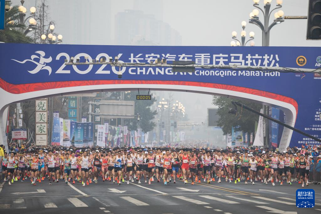 当日,2026重庆马拉松赛在重庆市南岸区南滨路烟雨公园鸣枪开跑,共有来自26个国家和地区的约2.5万名选手参赛。
