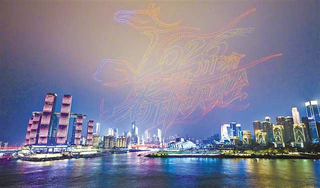 一月二十四日,“新韵重庆”无人机灯光秀,无人机排列出二○二六川渝春节联欢晚会主题图案。记者 张锦辉 摄\视觉重庆