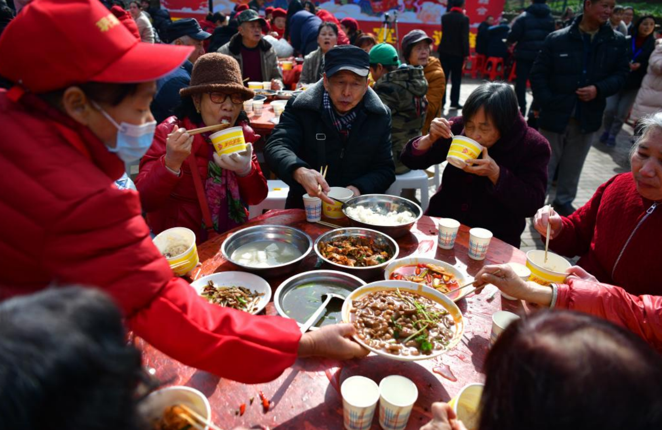 台上,非洲鼓表演节奏欢快,川剧变脸引人喝彩,戏曲舞蹈韵味十足,赢得掌声如潮。台下,70张圆桌整齐摆放,围坐着来自綦江区丁山镇石佛村和贵州省习水县寨坝镇条台村的乡亲们。回锅肉、酥肉汤、泡椒猪肝……一道道农家菜陆续上桌,热气腾腾,香气四溢,年的味道在欢声笑语中愈发浓厚。