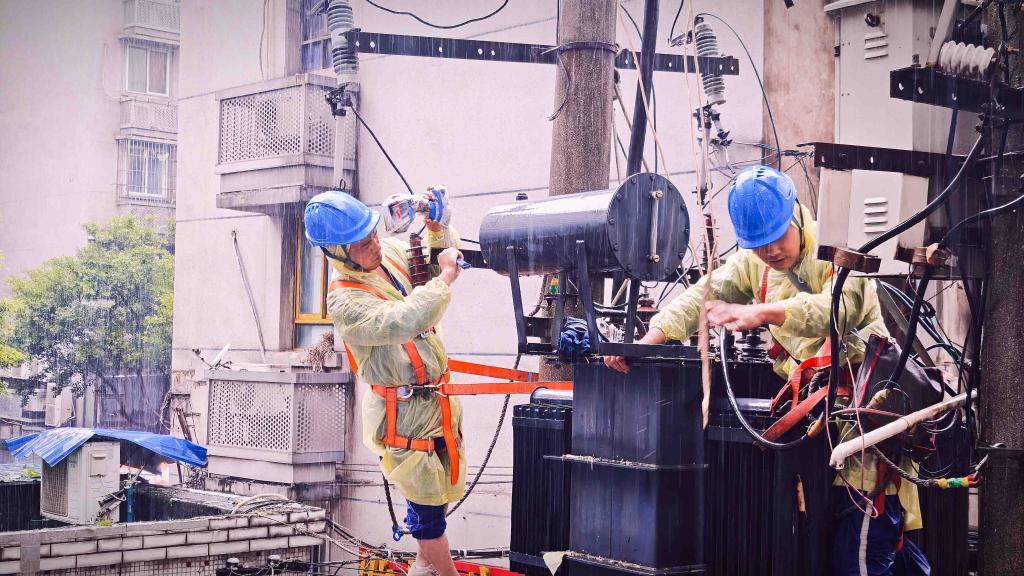 图为国网重庆市区供电公司抢修人员冒雨抢修沙坪坝区沙北街10千伏正公支线开北1号杆。(韩薇 摄)