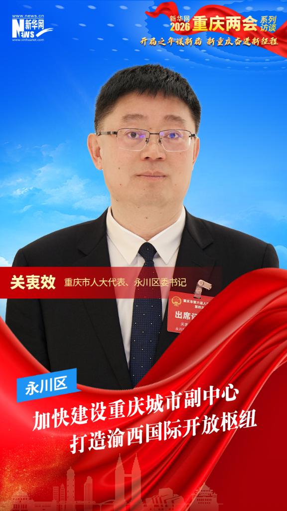 新华网重庆1月31日电(刘磊)“站在‘十五五’新的起点上,永川将牢牢扛起‘加快建设重庆城市副中心、打造渝西国际开放枢纽’两大使命,紧扣‘现代制造业基地、西部职教基地’两大定位,全面提升产业能级、城市能级、开放能级和公共服务能级,加快建设成渝中部现代化人民城市。”近日,重庆市人大代表、永川区委书记关衷效在接受新华网2026重庆两会系列访谈时表示。