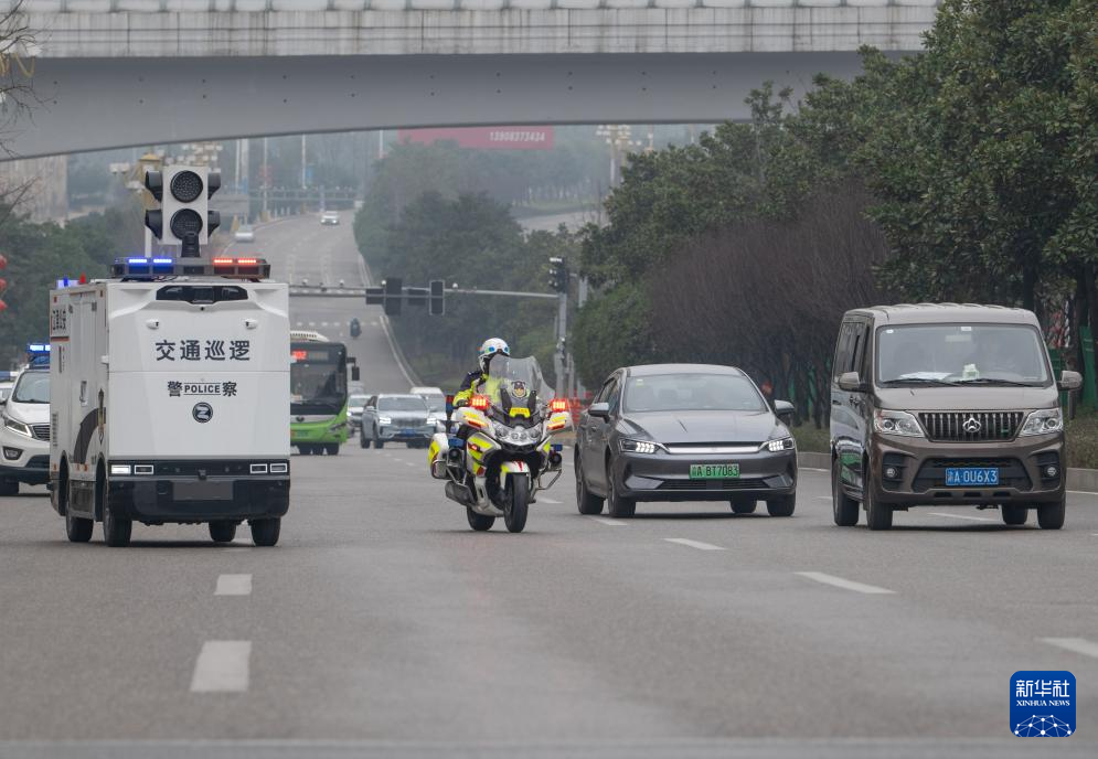 2月4日,“AI警员”(智能无人巡检装备)与重庆市江津区公安局交通管理支队警员一起巡逻。新华社记者 陈诚 摄