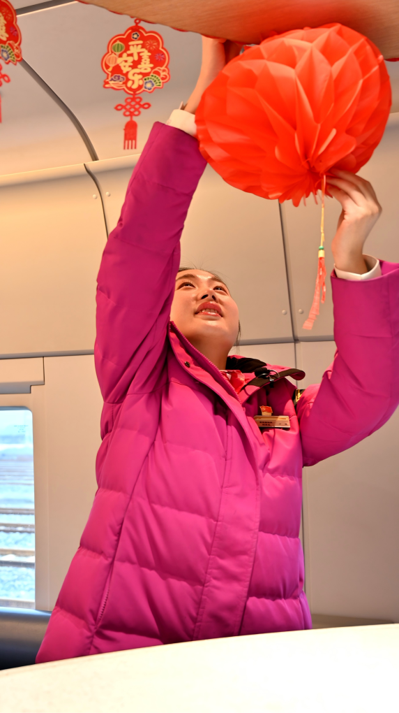 暮色轻笼,重庆西动车所的存车线依旧静谧,这辆热备动车组的车厢里却灯光常亮。红彤彤的灯笼挂在车厢各处,浓浓的年味飘满整个列车,值守的工作人员各守岗位、默默待命,整列车厢既有新春的温馨,更有坚守的力量。