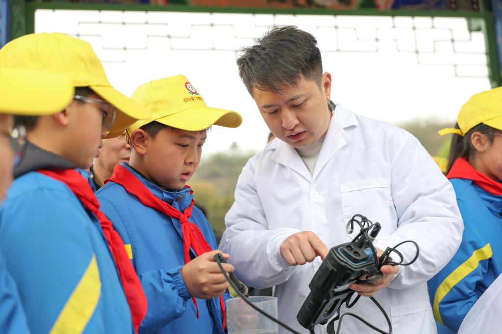 3月20日,在重庆市永川区神女湖边,工作人员现场教红河小学“小黄帽”志愿服务队的同学体验水质检测流程。