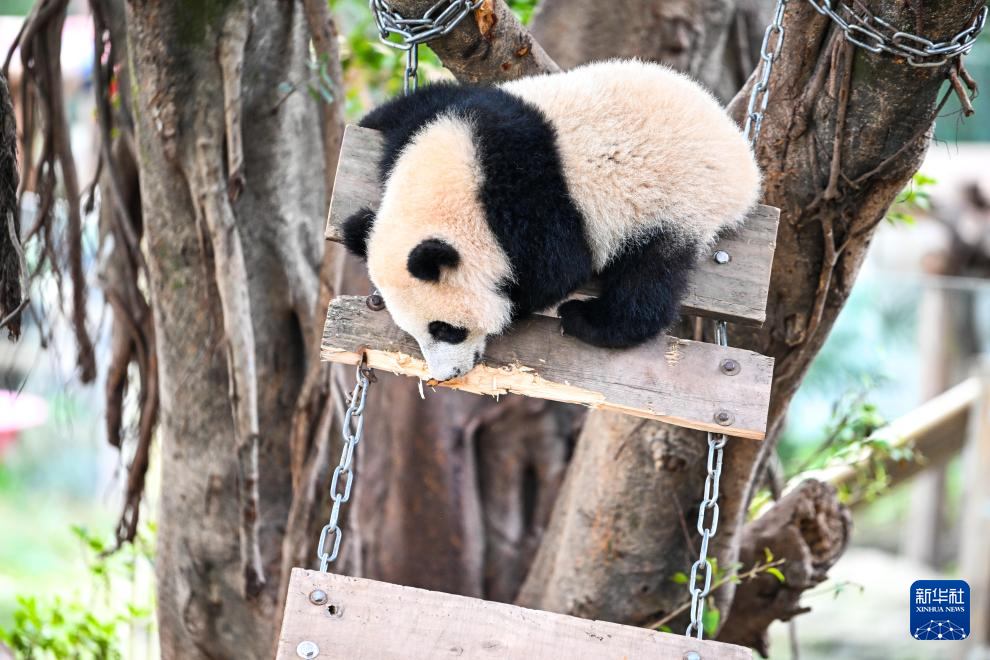 2月24日,大熊猫在户外玩耍。新华社记者 唐奕 摄